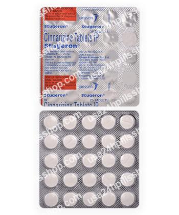 Stugeronis an anti-histaminic drug which main application is to control vomiting caused by motion sickness. This medication is used to treat cerebrovascular insufficiency (dizziness, tinnitus, decreased ability to concentrate attention or memory, etc.), discirculatory encephalopathy, involutional psychosis or depression, conditions after a stroke or traumatic brain injury, migraine, vestibular disorders (Meniere's syndrome, kinetosis etc. which appear as disequilibrium, nausea, vomiting, nystagmus), peripheral circulation disorders (Raynaud's disease, arteriosclerosis obliterans, thromboangiitis, diabetic angiopathy, trophic and varicose ulcers, acrocyanosis, paresthesia, nocturnal cramps and cold extremities).